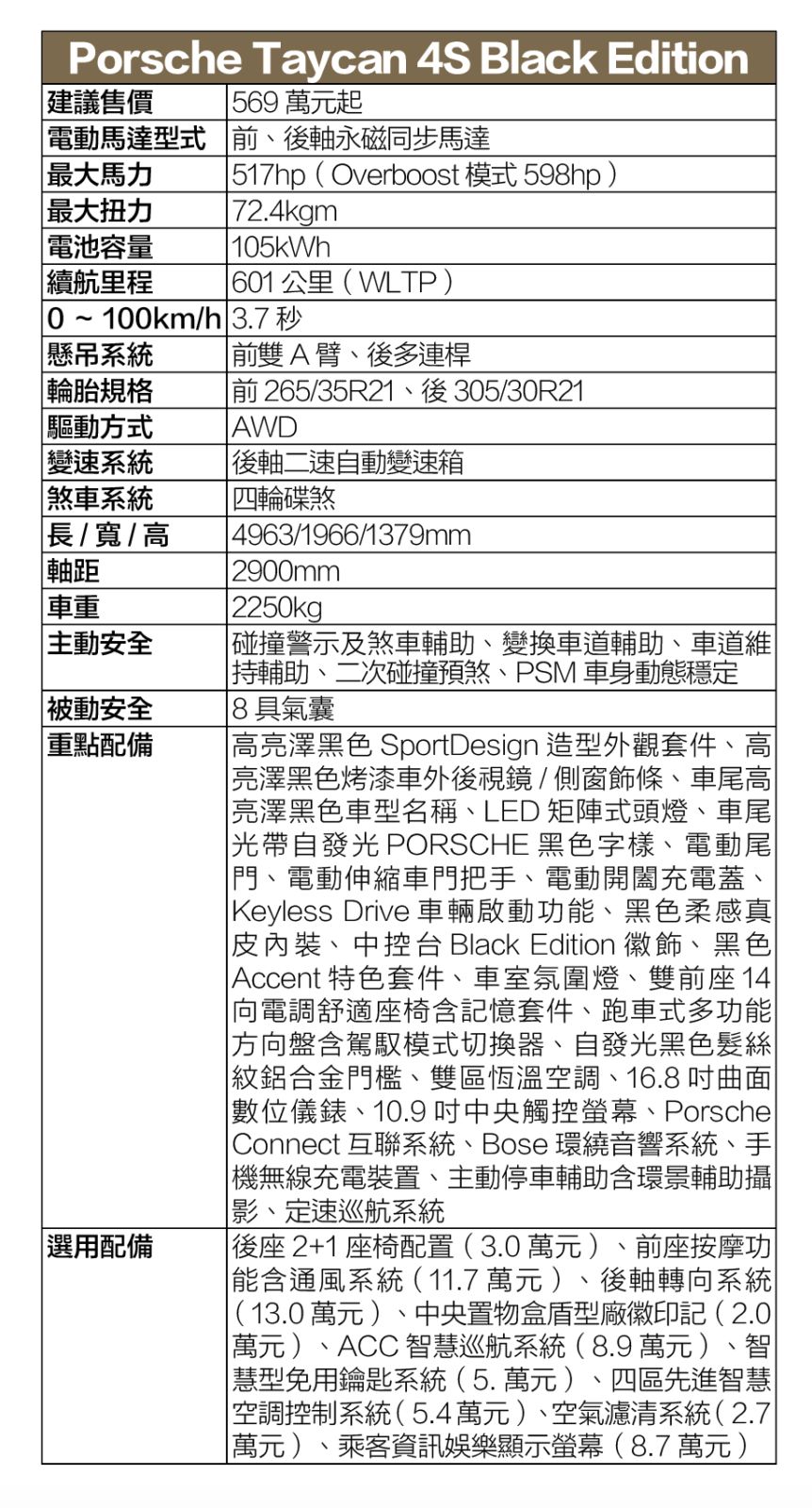 ●建議售價 569萬元起●續航里程 674km(WLTP)●討喜之處 專屬造型元素+豐富配備水準●遺珠之憾 僅提供四門房車版本文/莊智顯 圖/高奕程與先前試駕的Cayenne E-Hybrid Coupe Black Edition相同,此次的Taycan 4S Black Edition同樣是作為..