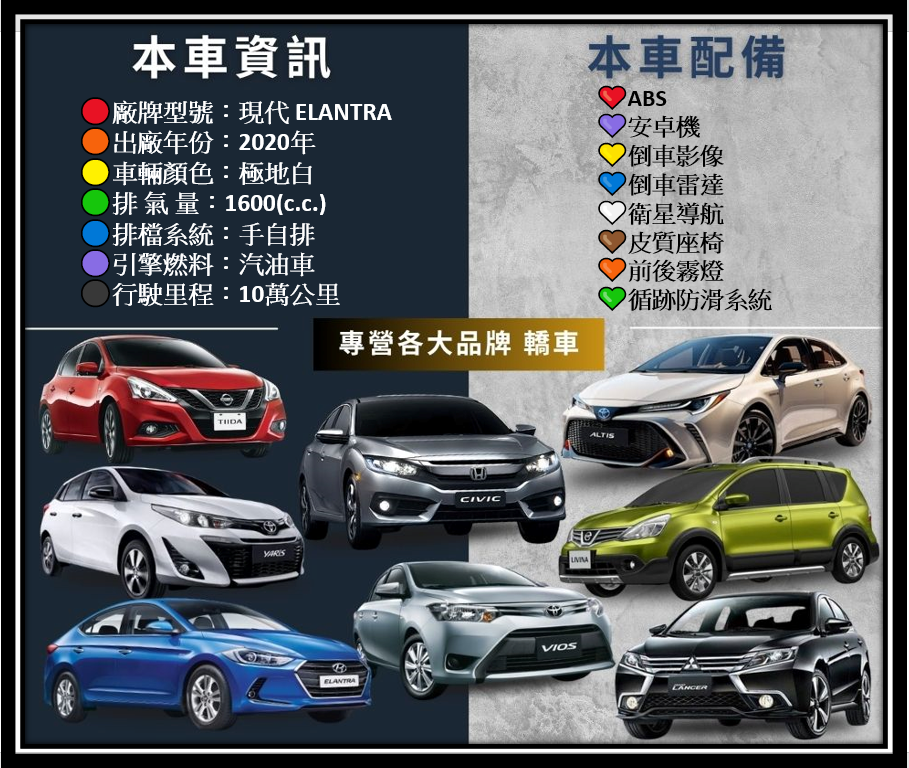 ABS,皮椅,安全氣囊,防盜,倒車雷達,電動後視鏡,電動窗,衛星導航,鋁圈,霧燈,TCS