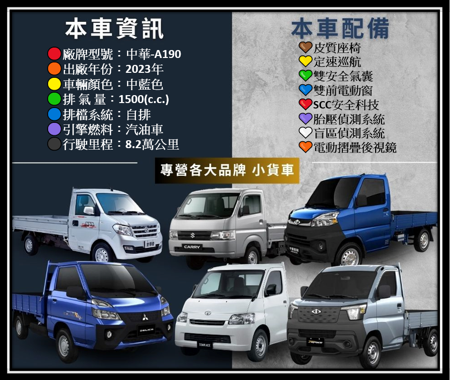 2023年中華A190貨車 1.5L 自排 頂級版~雙安全氣囊+盲區偵測 電動收折後視鏡+原廠定期保養 一手車~框式木床~,商用車首選